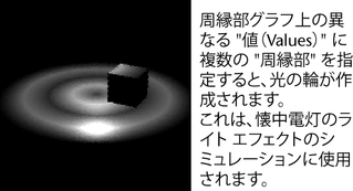 このオプションは、円錐と円柱のライト シェイプにのみ適用されます。半影を調整するアトリビュートが含まれます。半影とは、影の境界と光の周囲にある部分的に照らされた領域です。グラフを使用して、ライトの拡散と減衰を調整できます。グラフの左側は円錐や円柱の外側のエッジの輝度を、右側はエッジまで伸びる光線の中心の輝度を表します。