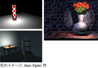 ライトのカラーを設定します。カラー サンプルをクリックし、カラー チューザ(Color Chooser)でライトのカラーを変更するか、ライトにテクスチャをマップします。テクスチャをマップすると、ライトによってテクスチャが投影されます(投影の細かい方式はライトのタイプにより異なります)。既定の設定は白です。次に、アンビエント ライトのColor アトリビュートにランプ テクスチャをマップしたときのレンダリング結果を示します。