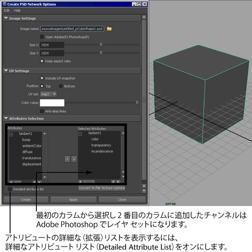 Maya 内部で PSD ファイルを作成するとき、Adobe Photoshop でペイントされるチャネルを選択します。