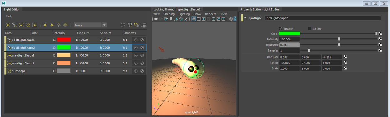 ライト エディタ(Light Editor)の選択項目から見る(Look Through Selected)機能を使用すると、シーン内でオブジェクトに対するライトの位置を簡単に調整できます。