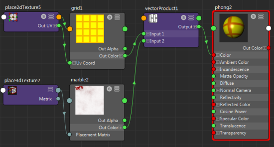 2 つのベクトル(光源の方向など)を掛け合わせたり、ベクトルと行列を掛け合わせたりします。ベクトル積(Vector Product)ノードには、2 つの入力アトリビュート、2 つの入力アトリビュートに適用する演算子、結果を保持する出力アトリビュートという 3 つの部分があります。