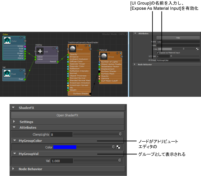 ShaderFX エディタを閉じると、Color はカテゴリ MyGroupColor にエクスポーズされ、Val はカテゴリ MyGroupVal にエクスポーズされます。
