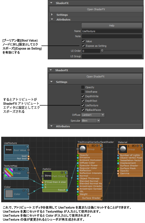 この例では、Bool Value ノードが作成されて、その目的を適切に反映するように名前が UseTexture に変更されます。Expose as Setting アトリビュートが有効になり、ShaderFX エディタを閉じるときに、アトリビュート エディタ(Attribute Editor)の Settings セクションで値を true または false に設定できるようになります。UseTexture を true に設定すると、TextureMap で拡散カラーを提供します。false に設定すると、Color で拡散カラーを提供します。