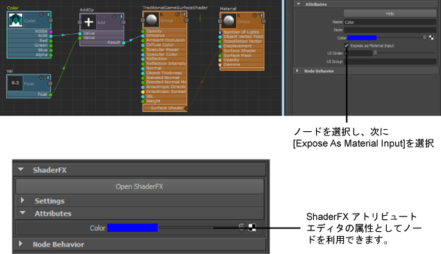 ShaderFX エディタが開いている状態で、ノードを選択し、ShaderfxShader アトリビュート エディタ(Attribute Editor)から Expose as Material Input をクリックします。