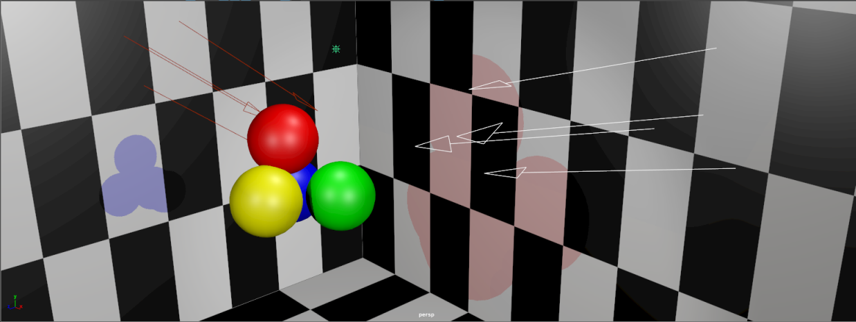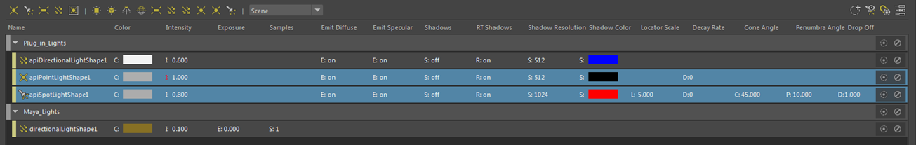 次の例では、3 つのプラグイン ライト ノードが作成されたシーンを示します。各ライトには、使用されるさまざまなアトリビュート セットとカスタム アイコンが一覧表示されています。プラグイン ライトが 2 つが選択され、ビューポートに表示されています。