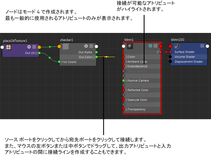 また、左マウス ボタンまたは中マウス ボタンでドラッグし、出力アトリビュートと入力アトリビュートの間に接続ラインを作成することもできます。接続ラインを解除するには、グラフ内の空の領域を左クリックするか、[Esc]キーを押します。
