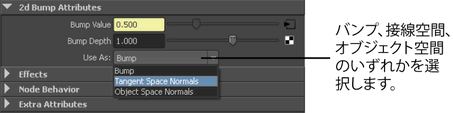 シーンの既存の bump2d ノードは、ハイパーシェード(Hypershade) ブラウザ(Browser)パネルのユーティリティ(Utilities)タブにあります。「ハイパーシェード(Hypershade)を使用してマテリアルを構築したり作成する」を参照してください。