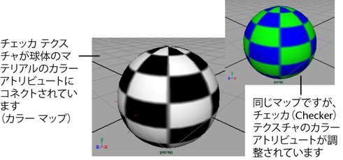 たとえば、カラー マップを適用したオブジェクトのマテリアルのカラー(Color)アトリビュートに Maya の 2D 白黒チェッカ(Checker)テクスチャを接続する場合は、テクスチャのチェッカ パターンに従って、オブジェクトの黒になる部分と白になる部分が決まります(テクスチャのカラー アトリビュートを調整した場合は、他の配色になります)。