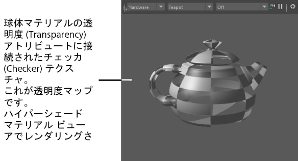 透明度マップを適用した透明度(Transparency)アトリビュートに、白黒のチェッカ(Checker)テクスチャを接続する場合は、チェッカのパターンに従って、オブジェクトの不透明な部分と透明な部分が決まります。