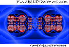 - ジュリア集合とボックス(Box with Julia Set):これはジュリア集合関数とマンデルボックス関数の組み合わせです。 これは反復に伴って行われるミラーリングまたは折り畳みです。 ジュリア U (Julia U)およびジュリア V (Julia V)アトリビュートと共にマンデルボックスパラメータを変更することで、多様なパターンを生成することが可能です。
