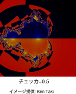 - エスケープ半径(Escape Radius)の超過が起きるとき、反復が停止します。 クラシックマンデルブロ集合のために、2 (以上)の値を用います。 しかし、集合上のいくつかの変動では、反復をより多くすると便利です。 チェッカーの効果で、値をより高くすると帯の目がより詰まります。 2 未満の値を用いて面白い効果を生み出すことも可能です。
