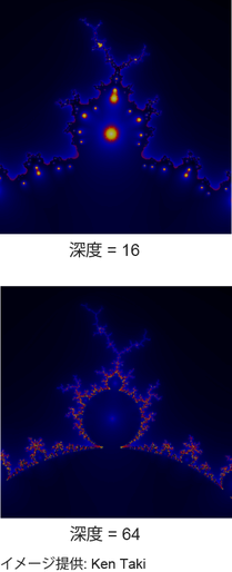 - このアトリビュートを用いて、マンデルブロテクスチャを生成するために実施される計算の量を判断します。 フラクタルテクスチャは、反復的かつ数学的なプロセスを通して生成されます。 反復の回数を増やせばより詳細なフラクタルが生成されますが、計算時間がより長くなります。 深度(Depth)の値が大きければ、それに応じてマンデルブロ集合の境界領域をより良好に解決することができます。 フラクタルの中にズームすると、より高い精度と緻密さを達成するためにより大きな深度(Depth)の値が必要となります。