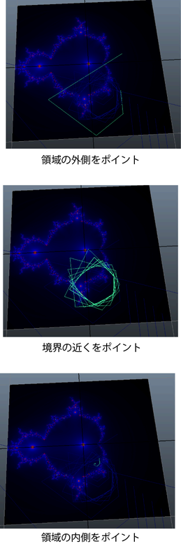 以下の図に、UV 空間中のポイントの位置に応じた様々な反復の挙動を示します。 ポイントが領域の境界付近に存在する場合、反復の回数は多くなり、反復パターンが形成されますが、原点から固定された距離の範囲内に留まります。 しかし、ポイントが領域の内側または外側に存在するとき、反復により非常に単純なカーブが生成されます。