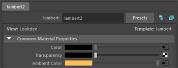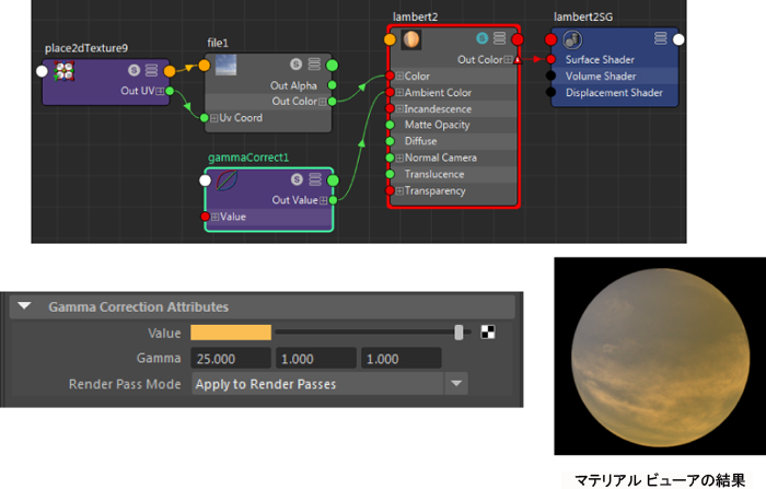ガンマ補正(Gamma Correct)アトリビュートを変更した後、Lambert (Lambert)マテリアルのアトリビュート エディタ(Attribute Editor)内のアンビエント カラー(Ambient Color)アトリビュートが更新されます。