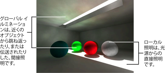 間接的なライトは、すべてシーン内で相互に反射したライトです。グローバル イルミネーションは、実世界の間接的なライトの伝送を模したものです。