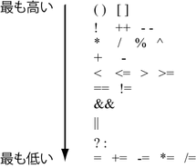 次の表では、MEL における演算子の優先順位について説明します。この図で同じ行に書かれている演算子の優先順位はすべて同じです。1 つの文に複数の演算子があり、これらの演算子が同じ優先順位である場合、一番左側にある演算子が最初に評価されます。単項演算子と代入演算子は右結合で、他の演算子はすべて左結合です。