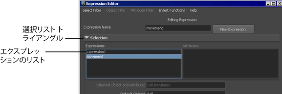 エクスプレッション エディタ(Expression Editor)には、既定で選択項目(Selection)リストが表示されます。選択項目リストには、オブジェクトとアトリビュートの一覧、または作成済みのエクスプレッションの一覧が表示されます。