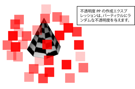 上記のエクスプレッションを、作成時のエクスプレッションではなく、ランタイム エクスプレッションとして使用する場合は、各パーティクルの不透明度はアニメーションの再生につれて、フレームごとに変化します。各フレームでランタイム エクスプレッションが実行され、各パーティクルの不透明度 PP (Opacity PP)に 0 ~ 1 の範囲のさまざまな乱数値を代入します。