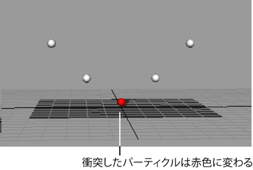 パーティクル オブジェクトを他のオブジェクトと衝突させる場合は、衝突の発生後にエクスプレッションの文をトリガするようなエクスプレッションを作成することができます。それにより、たとえば、衝突を起こしたパーティクルのカラーや不透明度を変更することができます。