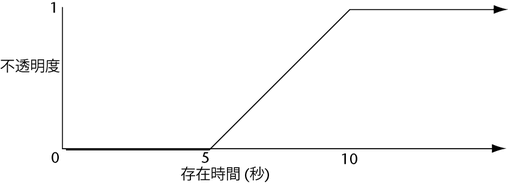 存在時間が 5 を超えると、linstep 関数は 1 を返します。不透明度は 100% 不透明のままです。次の表に、不透明度アトリビュートに代入される値の例を示します。