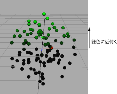 以上のようにして、パーティクルの位置に応じてパーティクルのカラーを黒色と緑色の間で変化させます。