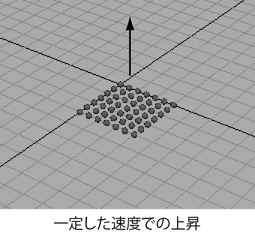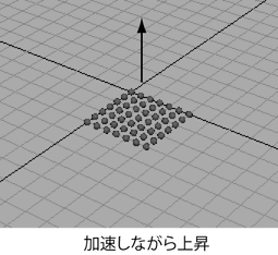 アニメーションを再生すると、時間の経過に伴って増加する time 変数の値が速度アトリビュートの Y 要素に代入され、Y 軸方向の移動速度が増加します。このため、グリッド内のすべてのパーティクルは、時間の経過とともに増加する速度で上昇します (増加する速度は加速度と呼ばれます)。