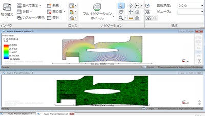 分割コマンドを実行すると、[モデル ビュー]ペインを別々のパネルに分割して同じスタディの複数の結果を同時に表示することができます。**各結果の名前は各パネルの左上隅に表示されます。
