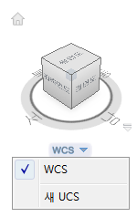 ViewCube 아래에 있는 UCS 메뉴에는 모형의 현재 UCS 이름이 표시됩니다. 메뉴에서 모형과 함께 저장된 이름 있는 UCS 중 하나를 복원하거나, WCS로 전환하거나, 새 UCS를 정의할 수 있습니다. 메뉴에 있는 WCS 항목을 사용하여 좌표계를 현재 UCS에서 WCS로 전환할 수 있습니다. 점 한 개, 두 개 또는 세 개를 기준으로 현재 UCS를 회전하여 새 UCS를 정의할 수 있습니다. 새 UCS를 클릭하면 새 UCS가 미지정이라는 기본 이름으로 정의됩니다. 새로 정의한 UCS에 이름을 지정하여 저장하려면 UCS 명령의 명명됨 옵션을 사용합니다.