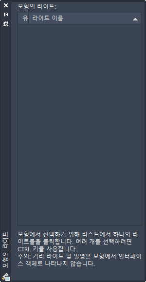 유형 열의 아이콘은 라이트의 유형(포인트 라이트, 스폿라이트, 거리 라이트) 및 라이트의 켜짐/꺼짐을 나타냅니다. 리스트에서 라이트를 선택하여 도면의 라이트를 선택합니다. 리스트를 정렬하려면 열 헤더에서 유형 또는 이름을 클릭합니다.
