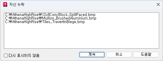 이 대화상자는 텍스처 맵의 경로가 더 이상 현재가 아닌 장면을 렌더할 때 나타납니다. 텍스처 맵이 이동 또는 삭제되었거나 드라이브 매핑이 다른 컴퓨터로 도면 파일을 이동한 경우 이러한 현상이 발생할 수 있습니다.