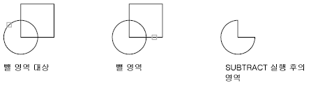 영역을 뺄 때는 두 번째 선택 세트의 객체를 첫 번째 선택 세트의 객체에서 뺀 다음 새 영역 하나를 작성합니다.