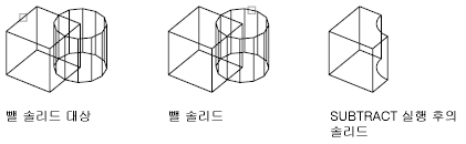 첫 번째 선택 세트의 객체에서 두 번째 선택 세트의 객체를 뺍니다. 새 3D 솔리드 또는 표면이 하나 작성됩니다.
