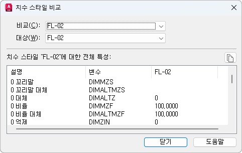 치수 스타일 비교 결과를 표시합니다. 서로 다른 두 스타일을 비교하면 각기 다른 특성이 표시됩니다. 두 번째 스타일을 <없음> 또는 첫 번째 스타일과 동일한 스타일로 설정하면 치수 스타일의 모든 특성이 표시됩니다.