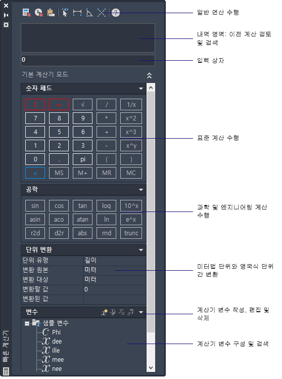 빠른 계산기에는 공학 계산기에서 제공되는 기본적인 기능 외에 기하학적 함수, 단위 변환 및 변수도 포함되어 있습니다.