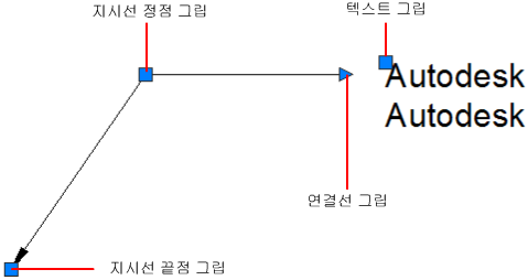 다기능 그립을 사용하여 여러 지시선을 직접 편집할 수 있습니다. 지시선 및 정점을 추가/제거하거나, 연결선을 길이조정/이동하거나, 지시선 문자를 이동할 수 있습니다.