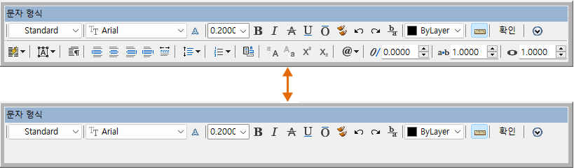 문자 형식 도구막대의 표시를 조정합니다. 이 옵션은 MTEXTTOOLBAR 시스템 변수를 설정합니다. (단일 행 문자에 대해서는 사용할 수 없습니다.)