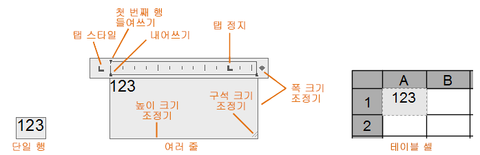 눈금자의 표시를 조정합니다. (테이블 셀 및 단일 행 문자에 대해서는 사용할 수 없습니다.)