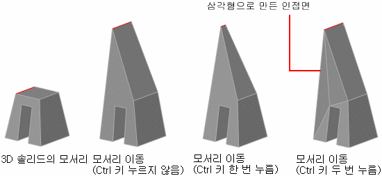 그립, 장치 및 명령을 사용하여 3D 솔리드 및 표면의 모서리를 이동, 회전 및 축척 조정합니다.