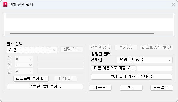 도면에 있는 선택된 한 객체를 필터 리스트에 추가합니다.