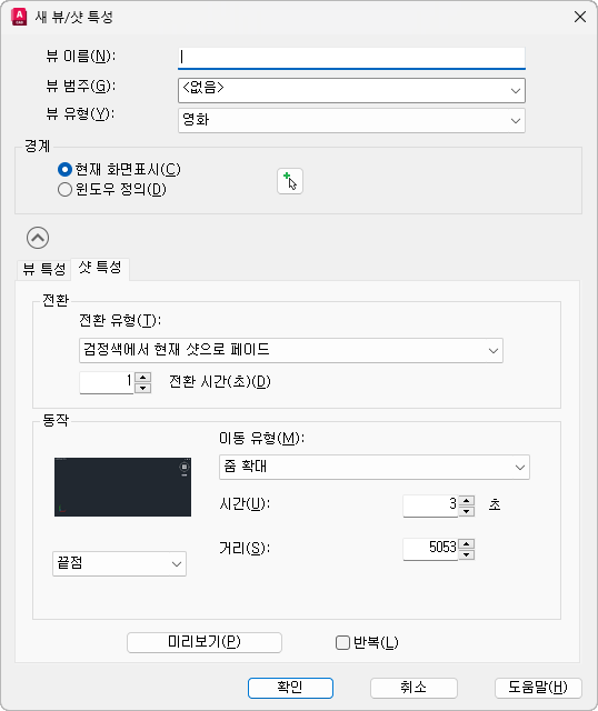 명명된 뷰에 Cinematic 뷰 유형이 지정되는 경우 명명된 뷰에 사용할 이동 유형을 설정합니다.
