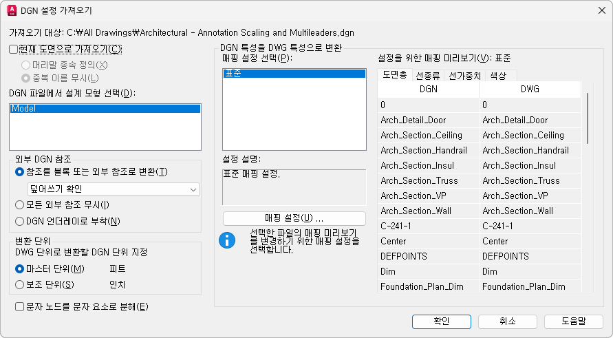 현재 DGN 가져오기에 사용되는 매핑 설정을 선택하고 관리합니다.