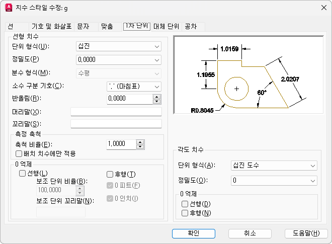 1차 치수 단위의 형식과 정밀도를 설정하고 치수 문자의 머리말과 꼬리말을 설정합니다.