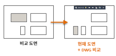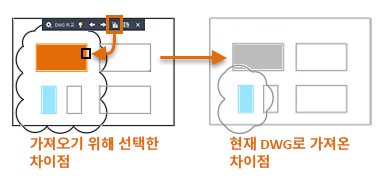 DWG 비교 도구막대를 사용하여, 비교 도면에서 현재 도면으로 차이점을 가져올 수 있습니다. 비교 도면에서 차이점이 있는 객체만 현재 도면으로 가져올 수 있습니다.