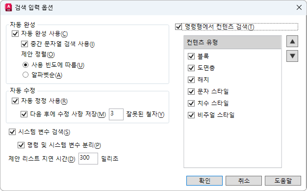 명령, 시스템 변수 및 명명된 컨텐츠(예: 블록 및 도면층)에 대한 명령행 제안 사항 리스트의 표시에 대한 설정을 조정합니다.