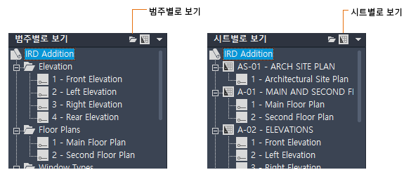 시트 리스트 탭에서 시트를 하위 세트라는 집합으로 정렬할 수 있습니다. 시트 뷰 탭에서 뷰를 범주라는 집합으로 정렬할 수 있습니다.