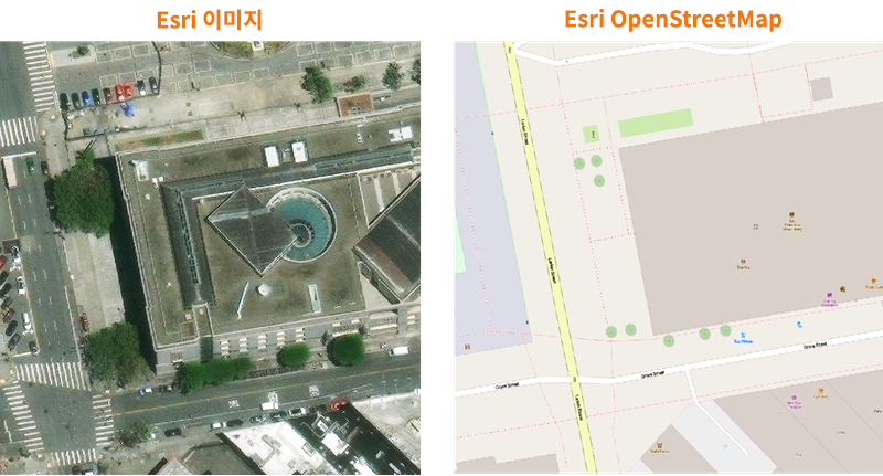 지도를 위성 이미지(Esri 이미지) 또는 벡터 이미지(Esri OpenStreetMap)로 표시할 수 있습니다. 도면 영역이 여러 뷰포트로 분할되면 각 뷰포트의 맵 스타일이 다를 수 있습니다.
