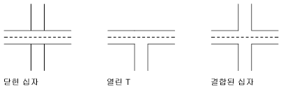 여러 줄은 십자 또는 T자 모양으로 교차할 수 있으며, 십자 또는 T자는 닫히거나 열리거나 결합될 수 있습니다.