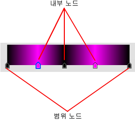 노드를 추가할 그라데이션 견본에서 아무 위치나 클릭합니다. 노드를 삭제하려면 노드를 견본 경계 영역 밖으로 끕니다.