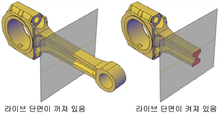 라이브 단면을 사용하여 단면 평면을 움직이고 조정하면서 3D 객체의 내부 정보를 동적으로 분석할 수 있습니다. 단면 평면 지시자의 관측 지점에 있는 모형 부분을 숨길지 아니면 잘라낼지 지정할 수 있습니다.