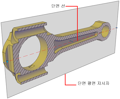 단면 객체에는 절단 평면으로 동작하는 투명한 단면 평면 지시자가 있습니다. 3D 솔리드, 평면 또는 영역으로 구성된 3D 모형에서 이 평면을 움직이면서 다양한 단면 뷰를 얻을 수 있습니다.